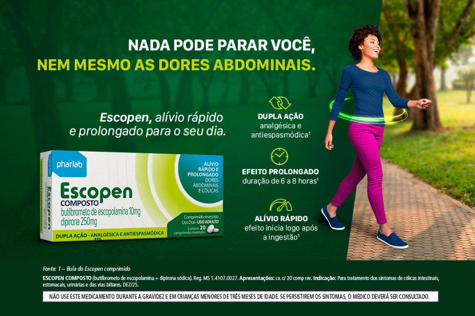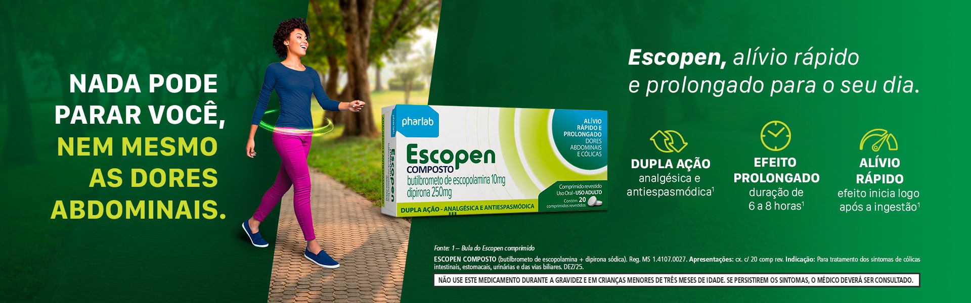 ESCOPEN COMPOSTO (butilbrometo de escopolamina + dipirona sódica). Reg. MS 1.4107.0027. Apresentações: cx. c/ 20 e 250 comp rev. Indicação: Para tratamento dos sintomas de cólicas intestinais, estomacais, urinárias, das vias biliares, dos órgãos sexuais femininos e menstruais. NÃO USE ESTE MEDICAMENTO DURANTE A GRAVIDEZ E EM CRIANÇAS MENORES DE TRÊS MESES DE IDADE. SE PERSISTIREM OS SINTOMAS, O MÉDICO DEVERÁ SER CONSULTADO. ¹Referência: Bula do produto. Fonte: IQVIA MAT DEZ/22 – UND